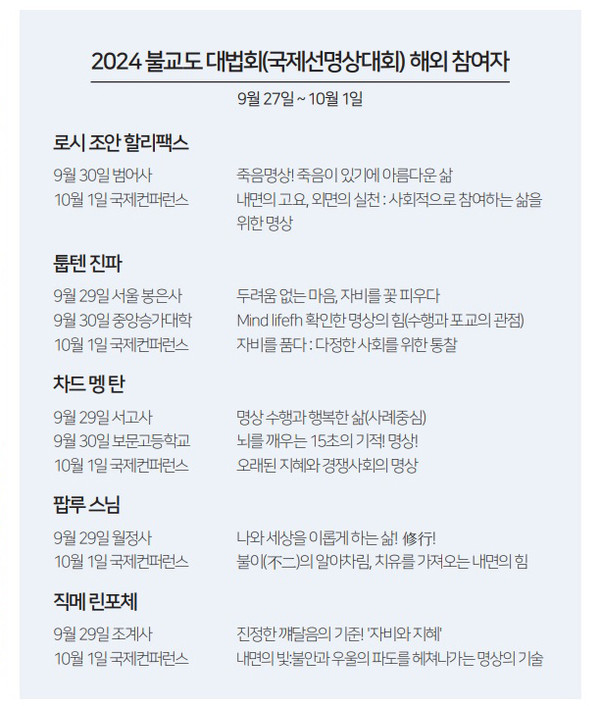 이들은 9월 27일 시작되는 환영 만찬을 시작으로 국제선명상대회 개막식, 특강, 컨퍼런스 등의 일정을 소화한다. 9월 28일 광화문광장에서 열리는 불교도대법회-국제선명상 대회 개막식에서는 조계종 총무원장 진우 스님과 무대에 올라 선명상 실참의 시간도 갖는다.