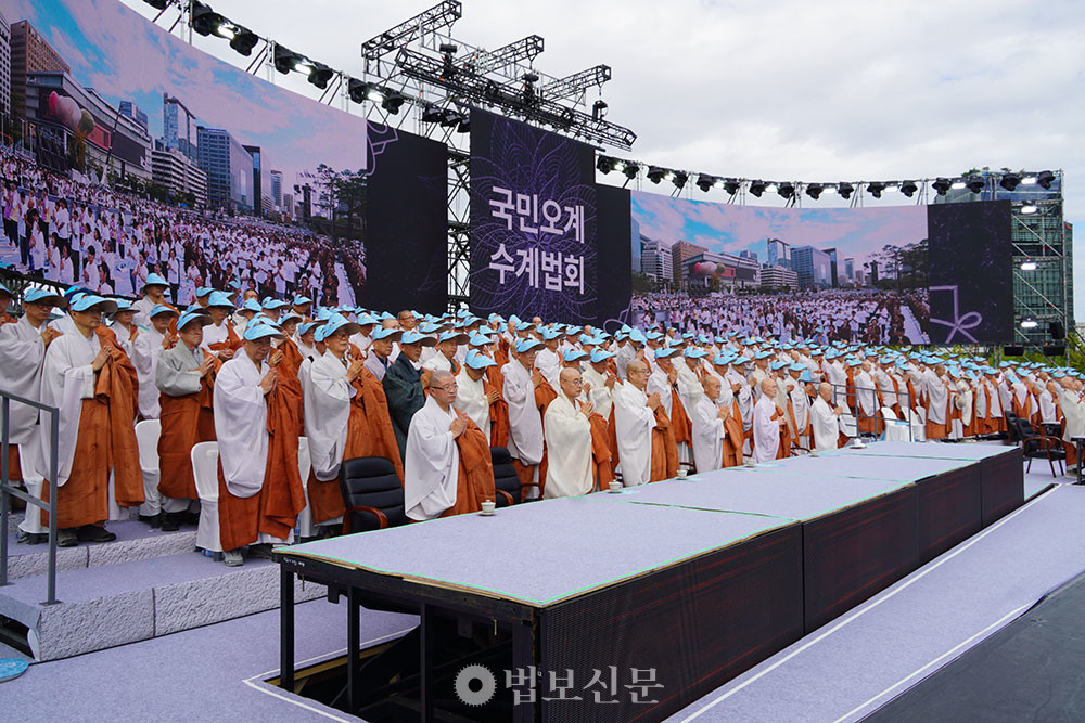수계법사로 법상에 오른 조계종 총무원장 진우 스님은 “국민 오계는 남에게 배우는 교훈이 아니고, 자기 자신을 완성하는 교육으로서 모든 국민들의 생활 지침”이라고 계의 의미를 설명했다. 이어 “모든 생명을 아끼고 존중하며, 남의 것을 탐하지 않고 나눔을 실천하는 것이 진정한 불자의 삶”이라며 오늘의 수계를 통해 각자의 마음을 정화하고 사회적 책임을 다할 것을 당부했다. 국민 오계는 △모든 생명을 아끼고 존중하자(불살생계) △남의 것을 탐하지 말고 나눔을 생활화하자(불투도계) △신의를 지키며 심신을 맑게 하자(불사음계) △나와 남을 속이지 말자(불망어계) △내 정신과 몸에 해로운 것들을 멀리하자(불음주계)의 다섯 가지다. 3만5000여 명의 수계제자들은 국민오계를 각자의 마음에 새기며 우리 사회에 새로운 가치를 제시할것을 발원했다.