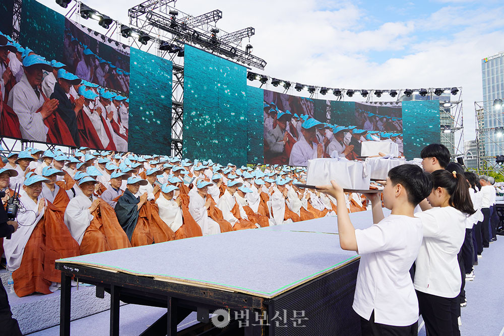 수계에 이어 오후 3시부터는 승보공양법회가 봉행됐다. 승보공양은 스님들께 공양을 올리며 불자의 실천을 다짐하는 의식으로, 이번 법회에서는 내 것을 내려놓고 상대를 존중하는 마음을 통해 상생하는 공동체로 나아가자는 의미를 담았다. 앞서 수계를 통해 청정한 몸과 마음을 갖춘 불자들은 스님들께 공양을 올리며 ‘비움’을 실천했다. 동참대중을 대표해 어린이, 청소년, 대학생, 청년, 신도 대표 등이 공양을 올리는 동안 참석자들은 마음을 모아 공양게송과 진언을 합송하며 승보를 향한 공경의 마음과 우리사회의 모든 이웃을 향한 존중의 마음을 나눴다.