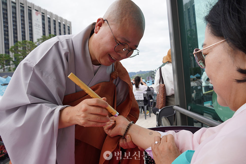 이어서 동참불자들이 장궤합장한 가운데 연비의식이 진행됐다. 600여명의 불교계 지도자들이 불자들을 대표해 연비했으며 스님들은 전국에서 동참한 수계제자 모두의 팔 위에 삼보륜 도장을 찍어주며 부처님과의 약속을 증명했다. 참회진언 ‘옴 살바 못자모지 사다야 사바하’의 장엄한 울림이 광화문광장을 휘감는 가운데 연비 의식이 이어지는 동안 수계제자들은 오늘의 발원이 우리 사회로 회향되길 기원했다. 이날 수계한 이상순(57세) 불자는 “전국 각지에서 모인 불자들과 함께 여 스님들의 말씀을 들으며 수계하니 불자로서 자긍심을 갖게 된다 ”며 “오늘 수계를 계기로 부처님이 전하고자 하셨던 말씀을 공부학 전하는 진짜 불자가 되고자 발원했다”고 소감을 전했다.