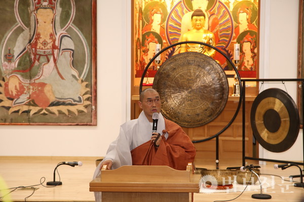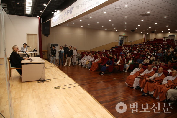 이날 행사는 ‘2024불교도 대법회(국제선명상대회)’ 참여를 위해 방한한 세계 유수의 명상지도자 가운데 미국 우파야 선 센터 주지 로시 조안 할리팩스 선사의 특강과 동국대 교수 혜주 스님이 진행하는 질의응답으로 진행됐다. 싱잉볼치유의소리의 싱잉볼 명상에 이어진 특강에는 범어사 주지 정오 스님, 조계종 미래본부 사무총장 성원 스님, 미타선원 원장 하림 스님, 정토마을 자재병원 이사장 능행 스님을 비롯한 스님들과 시민·불자 등 사부대중 500여 명이 동참했다.