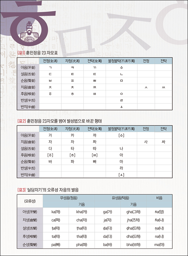 ‘훈민정음해례본’에는 한글의 자모 17자와 모음 11자의 28자가 만들어지고 서로 결합하는 원리가 상세히 나타난다. 이 문자 가운데 자음의 문자는 그 발성기관의 위치에 따라 아음(어금닛소리), 설음(혓소리), 순음(입술소리), 치음(잇소리), 후음(목구멍소리), 반설음, 반치음으로, 그리고 목에서 나오는 소리의 강세에 따라 전청(무성무기음), 차청(무성유기음), 전탁(유성유기음), 불청불탁(비음, 반모음 등의 공명음)으로 구분한다. [표1] 이러한 문자의 구분은 기본 문자(ㄱ, ㄴ, ㅁ, ㅅ, ㅇ)의 형태에서 획수가 더해진 가획의 형태(예: ㄴ-ㄷ-ㅌ)로 만들어져 한글 문자가 과학적이고 체계적인 방식으로 제작된 것임을 알려준다. 그리고 모음은 아, 야, 어, 여 등 11개의 모음이 만들어지고, 이 모음과 앞서의 자음이 합쳐져 글자의 형태를 이룬다. 이러한 한글의 문자 형태는 기본적으로 범어와 상당히 유사하다.