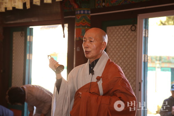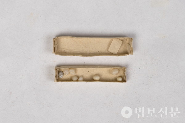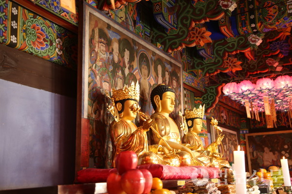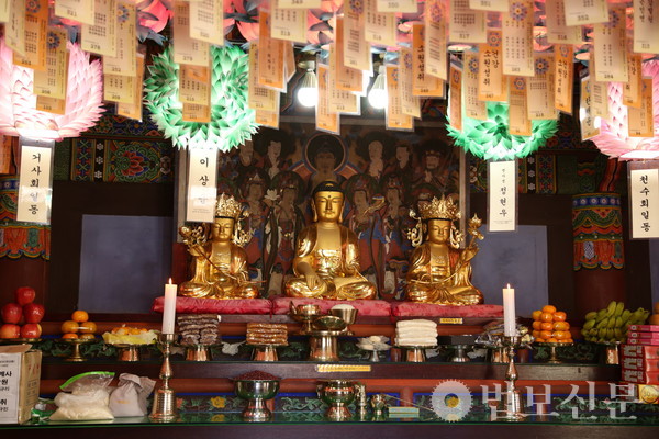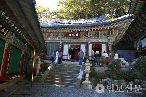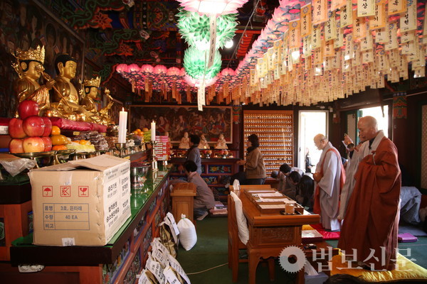마하사(주지 정산 스님)는 11월6일 응진전(나한전)에서 봉행된 ‘마하사 응진전 영산회상도 보전처리 완료 이운식 및 음력 10월 정기 나한기도’에서 이같이 밝혔다. 마하사 주지 정산 스님에 따르면, 마하사는 응진전의 높은 습도와 통기 등이 원활하지 않은 상황을 고려, 부산시 유형문화유산인 응진전 영산회상도의 보전처리를 지난 1월16일부터 9월10일까지 진행했다. 특히 이 과정에서 영산회상도의 복장유물의 후령통 내 오보병 아래 종이로 만든 사리함에 진신사리 8과가 봉안돼 있음을 확인했다. 이후 보존처리를 마친 영산회상도에 순서대로 본 위치에 재납입을 완료, 이날 이운식을 거쳐 나한전의 삼존불 후불탱 위치에 봉안했다.