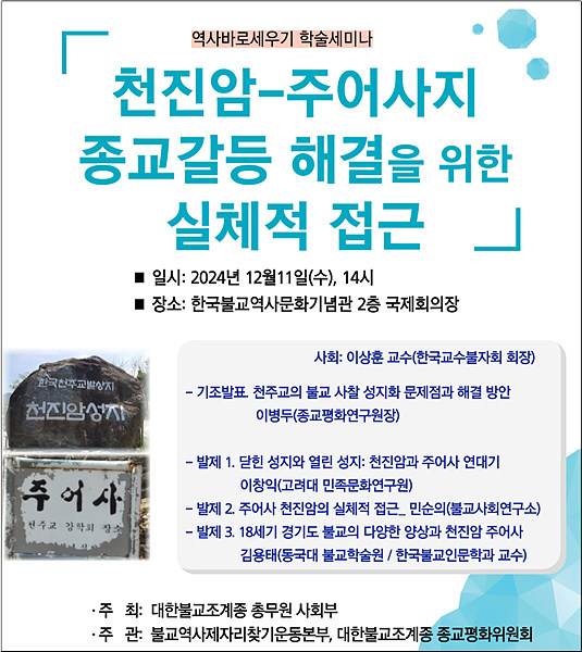 천주교가 광주 천진암과 여주 주어사지, 홍성 홍주읍성 등을 성지화하면서 불교계와 갈등이 커진 가운데, 천주교의 역사 왜곡과 지자체의 종교 편향 문제에 대응하고, 종교 간 평화 공존을 모색하는 학술 세미나가 열린다.