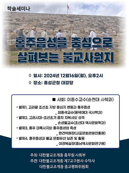 두 번째 세미나는 ‘홍성지역 불교사의 재조명 - 홍주읍성을 중심으로 살펴보는 불교 사원지’를 주제로 12월 16일 오후 2시 홍성군청 대강당에서 열린다. 최종석 동덕여대 교수가 ‘고려 말 조선 초 지방 중심지 변동과 홍주읍성’, 손성필 조선대 교수가 ‘고려시대~조선 초기 읍치 자복사의 성격’, 한건택 내포문화관광진흥원 원장이 ‘홍주 미륵사지와 홍주읍성의 축성’, 이경복 충남역사문화연구원 연구실장이 ‘홍주읍성과 불교 문화유산 보존 및 활용 방안’을 각각 발제한다.