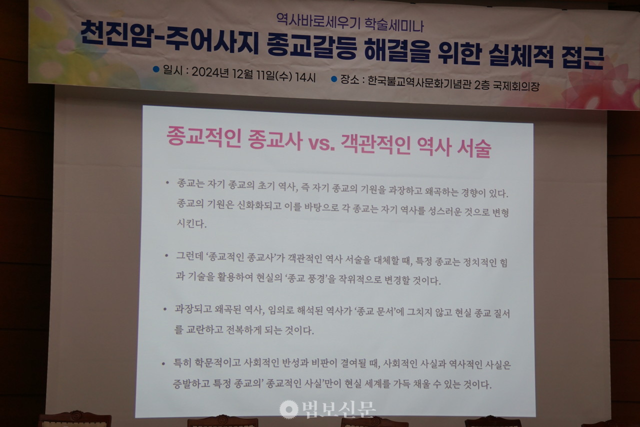 경기도 광주 천진암과 여주 주어사지는 18세기 천주학을 연구하던 학자들에게 강학 장소를 제공하고 관을 피해 온 가톨릭인들을 보호한 사찰로, 불교의 포용성을 보여주는 상징적인 공간이다. 하지만 19세기 폐사된 후 현대에 들어 가톨릭이 천진암과 주어사지, 홍주읍성 등을 성지화하면서 불교계와 마찰을 빚어왔다. 양측의 갈등이 커진 가운데 이번 세미나는 역사적 고증과 문헌을 기반으로 불교 역사 왜곡에 대응하고 종교 편향을 불식하기 위해 개최됐다.