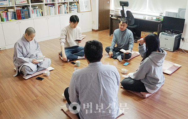 3월 9일 서울 종로의 한 오피스텔에서 한 명의 스님과 3명의 대학생이 참여한 가운데, 이필원 동국대 와이즈캠퍼스 교수가 진행하는 경전 강독회가 열렸다. 강독회 시작 전, 참석자들은 오피스텔에 마련된 불단을 향해 삼배를 올리고, 삼귀의와 ‘자애경’을 외우며 마음을 가다듬었다. 매주 경주에서 서울까지 왕복하는 강행군에도 이 교수는 “부처님의 가르침을 직접 접할 기회를 제공하는 것이 중요하다”며 “또래와 함께 공부하고 대화하며 성장하는 소규모 모임이야말로 불교 대중화에 실질적인 영향을 미칠 수 있다”고 강조했다. 짧은 말 속에서도 불교 대중화와 질적으로 우수한 불자 양성에 대한 그의 깊은 고민이 묻어났다.