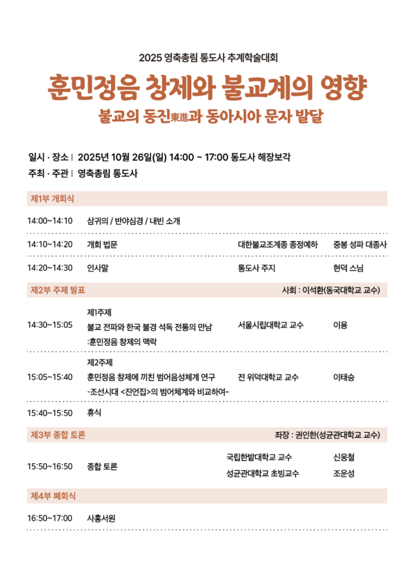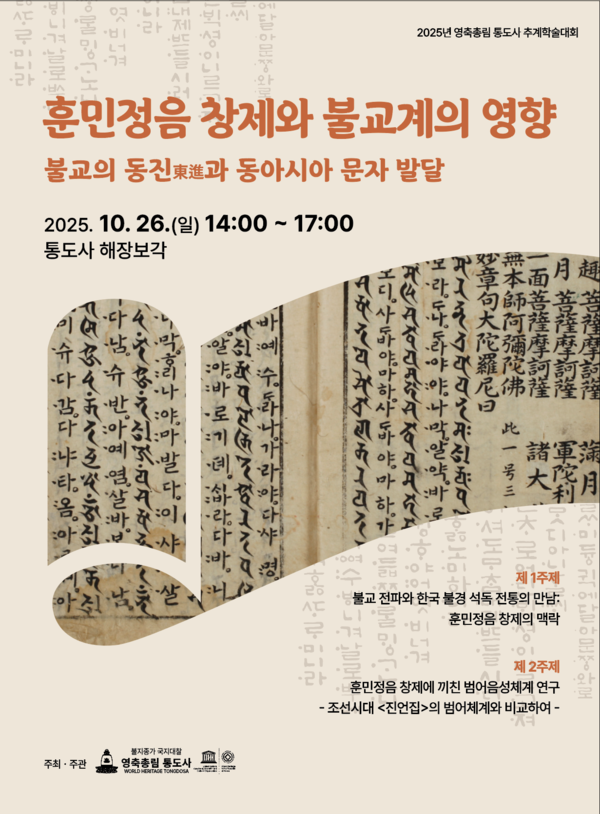 영축총림 통도사(주지 현덕 스님)는 오는 10월 26일 오후 2시부터 5시까지 경내 해장보각에서 ‘훈민정음 창제와 불교계의 영향 - 불교의 동진과 동아시아 문자 발달’을 주제로 2025년 추계학술대회를 개최한다.