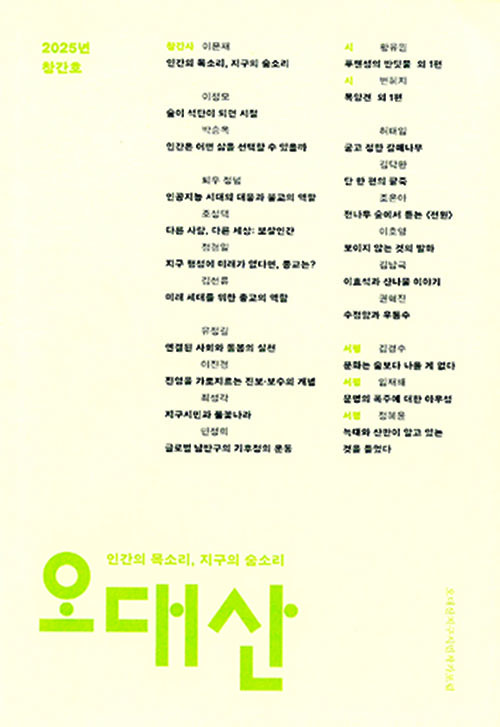 ‘오대산’의 편집 책임을 맡은 이문재 시인은 “기후위기 앞에서 인간의 언어는 지체되고 있다”며 “‘극한 호우’ ‘기후지옥’과 같은 새로운 언어가 탄생하는 현실 속에서, 인류가 입을 닫고 귀를 열어야 할 때”라고 말한다. 인간의 말만을 절대화해온 근대 문명이 자연의 숨소리를 외면해온 결과가 오늘의 재난이며, 이제는 멈춰 서서 영혼이 따라올 시간을 기다려야 한다는 것이다.