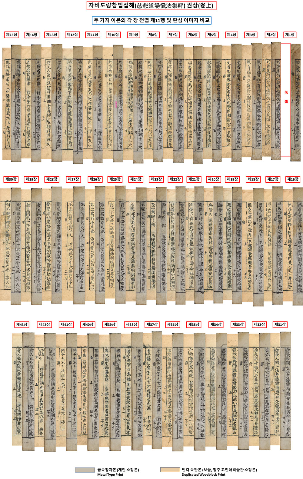 금속활자본과 번각목판본의 이미지를 비교해 보면 세로 방향의 인쇄 길이가 금속활자본과 번각목판본의 차이가 확연하게 드러난다. 금속활자로 인쇄된 종이를 목판에 뒤집어 붙이고 판각을 한 다음 인쇄를 하게 되면 목판의 건조로 인하여 한쪽 방향으로 수% 정도 줄어들게 되어 번각 목판본의 길이 방향의 크기가 금속활자본보다 줄어드는 현상이 나타난다. “자비도량참법집해‘ 개인 소장본의 길이 방향의 크기가 모든 장에서 보물로 지정된 청주 고인쇄박물관 소장본보다 길다. 이것은 개인 소장본이 청주 고인쇄박물관 소장본보다 이른 시기에 금속활자로 인쇄된 판본임을 증명하고 있다.