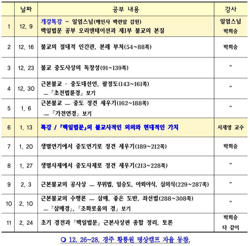 이번 동안거 특별강좌에서는 성철 스님이 ‘백일법문’에서 인용한 초기경전 ‘초전법륜경’, ‘가전연경’, ‘삼매경’, ‘조화로움의 경’ 등을 대조해 살피며, 초기경전과 대승경전, 선어록이 모두 중도로 회통함을 바로 알아 정견을 세우는 데 집중할 예정이다. 강의는 생활선명상센터에서 온라인으로 진행되며, 개강일에는 해인사 백련암 감원 일엄 스님의 특강, 1월 13일에는 성철사상연구원 서재영 원장의 특강이 마련된다.