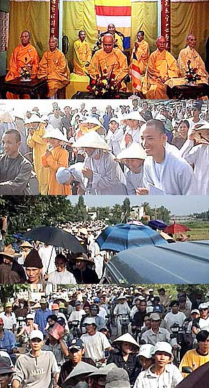 1월 11일 새벽 38년만에 고국땅을 밟게 된 틱낫한 스님을 환영하는 인파들이 하노이 공항을 가득 메웠다. 이날 베트남 불교의 ‘봄날’이라도 온 것처럼 스님을 환영하는 플랜카드들과 꽃들이 거리 곳곳에 펄럭이고 있었다. 일부에서는 세계적인 스타 틱낫한 스님의 귀환을 허용한 것에 대해 베트남 정부의 종교적 개방정책(도이모이)이라 설명하며 베트남 인권과 종교 자유의 확대에 대한 기대감을 감추지 않았다.<사진설명>UBCV소속 스님들(맨위)과 2003년 파리에서 열린 UBCV회원들의 거리행진(아래).
