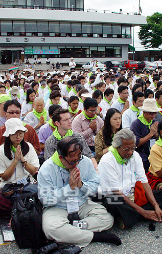 <사진설명>2003년 한국 INEB대회에 참가한 세계 18개국 불교 NGO활동가 100여명은 임진각을 방문해 한국 평화를 기원하는 법회를 열고 '자유의 다리'위에서 기념촬영을 했다.개인의 힘은 미약하지만 다수의 힘은 세상을 바꾼다. 물방울이 모여 강과 바다를 이루고, 산이 모여 산맥과 백두대간을 이루듯이.