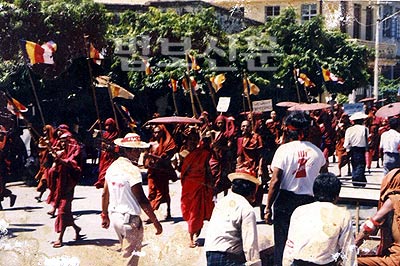 <사진설명>수많은 스님들이 1988년 8월 8일 버마 방방곡곡에서 민중들의 봉기에 가담했다. 그들은 눈물 젖은 승복을 벗어 던지고 전사로 변신했다.이처럼 군인독재자들로부터 탄압받으면서 결국, 승려들은 지하에서 정치투쟁조직을 일궈냈다. 랭군과 남부지역을 축으로 삼은 청년승려연합(YMU)과 만달레이와 중부지역을 낀 승가연합(Sangha Samagi)을 비롯해 7개 승려단체가 민주화투쟁을 선도해 왔고, 또 망명 승려 3백여명이 조직한 버마청년승려연합(ABYMU)은 버마 내부 승려 100여명을 비선으로 묶어 연대투쟁을 벌여왔다. 이 승려조직들이 학생·노동자들과 함께 민주화투쟁을 주도했고, 아웅산 수지의 민족민주동맹(NLD)이 압승을 거둔 1990년 총선 결과를 뒤엎은 군사정부에 종교거부운동으로 맞섰다. 1997년 경제위기에 빠진 군사정부가 불상에서 루비를 뽑아간 사건을 놓고 8천여 승려들이 운집했던 ‘만달레이 마하 미야트무니 봉기’도, 그리고 군사정부가 대화에 나서도록 압박했던 이른바 ‘9999운동’도 모두 이 승려단체들이 이끌었던 투쟁이다.