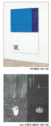 다양한 색상을 배경으로 한 화면에 검정, 노랑 색의 작은 원형의 점이 찍혀있는가 하면 일상의 모습에서 추출하거나 자신의 관념세계를 기호화한 흔적들이 별처럼 흩어져있다. 그런가하면 참선하는 형상, 부처님의 수인, 연잎, 자신의 몸, 작업실에서 내다보이는 저녁노을과 환한 달, 한글과 한문으로 감칠맛 나게 쓰인 문자 들이 어우러져있고 그것들끼리 한 폭의 풍경을 보여준다.