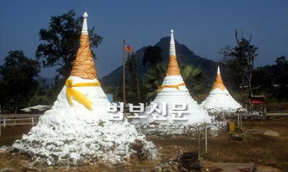소문난 스리 파고다즈 파스를 쫓아 방콕에서 예닐곱 시간 산길을 힘들게 달려온 이들이라면, 그 탑들을 보는 순간 절로 한숨이 나고 맥이 빠지고 만다. 예술성이라고는 눈꼽 만큼도 없는 돌탑에다가 흰 페인트칠로 뒤덮어 놓은 그 풍경 앞에서!
