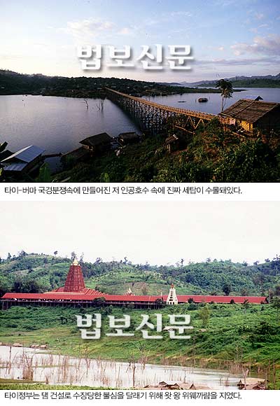 졸지에 물 속으로 사라진 탑버마 중앙정부가 그렇게 혼란을 겪고 있는 사이, 1983년 타이 정부는 상크라부리에 카오 라엠댐을 세워 고대 스리 파고다즈 파스를 낀 버마 국경 일대를 수몰시켜 버렸다. 그렇게 해서 예부터 버마-타이 국경선이라고 여겨왔던 스리 파고다즈는 거대한 인공호수 속에 수장되고 말았다.