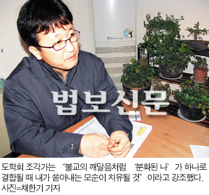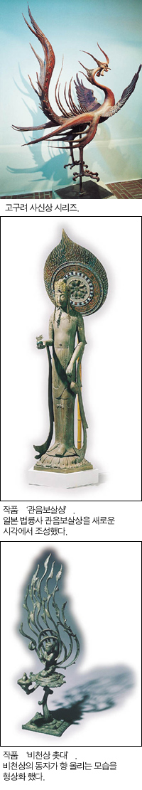 최근 도학회는 일본 법륭사에 있는 관음보살상을 번안해 재현했다. 기계적인 모방도 아니고 그렇다고 완전히 새롭게 해석한 것도 아닌 상태에서 관음보살상을 원래의 사상적 측면으로 복귀시키고자 하는 의도에서 약간의 변형, 그러니까 작가의 자의적 상상력을 가해 만든 것이다. 현실기복만이 강조되는 데서 벗어나 수행자의 측면을 강조한 형상이 그것이다. 작가는 조각의 전통을 찾아나가다 보니 동·서양 문화의 거대한 흐름 속에서 관음보살상, 관음신앙을 만났다고 말한다.얼마 전 일본에 가서 법륭사 관음보살상 앞에서 꽤나 오랫동안 머물면서 그 매력에 한껏 도취되었던 기억을 떠올려보았다. 대단한 작품이었다. 작가는 우리 전통문화를 보편적 시각으로 바라보고자 하며 동시에 조선시대의 진경산수처럼 조각의 진경을 찾는 일 역시 병행하고자 한다. 그런 탐구와 모색이 자연스레 우리네 전통조각, 불상조각에 가닿았고 거슬러 올라가 인도조각, 이집트와 그리스 조각까지 아우르면서 결국 그 모든 조각세계와 만나고 합치되는 광활한 영역을 깨닫게 되었다고 말한다. 그 한 복판에 관음상이 놓여있다. 그래서인지 도학회는 자신을 소개하는 이력의 글을 매우 흥미롭게 기술하고 있다.