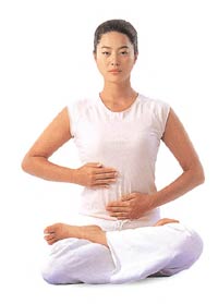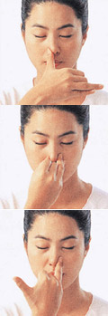 이 호흡법은 교감신경을 조화롭게 하여 불안하고 긴장된 마음을 안정시켜주고 정신을 맑게 해주는 효과가 있습니다. 또 몸 안의 에너지 흐름을 균형 있게 만들어 비만을 해소해 줍니다.1. 척추를 반듯이 세워 앉아 왼손은 엄지와 검지를 맞대고 왼쪽 무릎 위에 편하게 올려놓는다. 오른손을 들어 엄지를 오른쪽 콧구멍에 댄다.