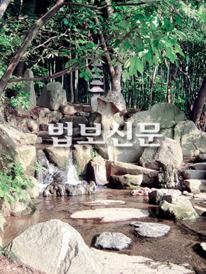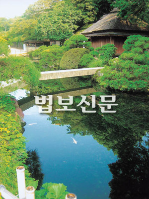 <사진설명>야쓰하시(八橋) 다리와 류텐(流店) 정자. 정자 한 가운데를 물길이 지나며 내부에는 아름다운 돌들이 배치돼 있다.‘분명 지겐도 불당 앞에 다실이 있다는데….’