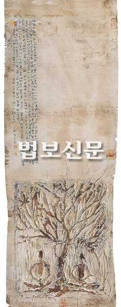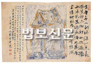 <사진설명>깊은 절, 깊은 맛(古寺宥餘). 한지고지(韓紙古紙)그의 작업은 한자문화와 모국어를 서예로 승화시키는 한편 한지와 흙, 모필의 특성을 자연스럽게 발효시켜내는 동시에 한국이라는 민족적 색깔과 풍토에 익숙한 원시적인 조형과 미감을 중후하고 침착한 표정으로 융합시켰다.