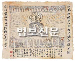 <사진설명>해인사 운(海印寺 韻). 지고지(韓紙古紙)여기에는 불교적 이미지가 강하게 투영되어 있다. 그의 상당 수 작품에는 다양한 불상 이미지가 화면에 올려져 있거나 사찰 문창살 이미지를 연상시키는 물고기 문양, 석가세존과 여덟 분의 부처상이 분청사기의 자잘한 점들과 선비들의 간찰 형태처럼 작게 눕혀서 자연스럽게 써내려간 글자들과 함께 배치되어 있다.