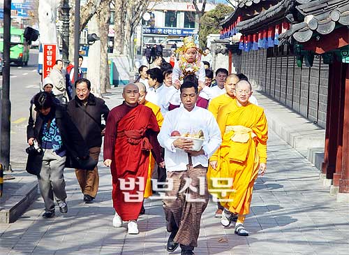탑골 공원으로 향하는 행렬은 장엄했다. 부처님께 올릴 쌀과 과일 등 공양물이 줄을 잇고 무등을 탄 재원이가 뒤를 따랐다. 산디마 스님과 3분의 태국 스님, 그리고 재원이 고모와 고모부, 큰 아버지, 미얀마 노동자들이 길게 꼬리를 이어 행렬을 이뤘다.