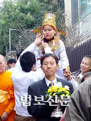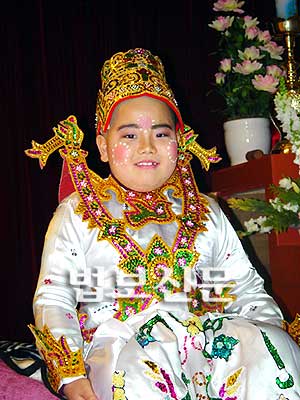 <사진설명>출가 의식 전 화려하게 치장한 재원이‘신쀼’가 있던 이날, 미얀마 선원의 풍경이 우리에겐 이채롭다. 출가 의식에서 볼 수 있는 깊은 침묵과 무거운 고요, 인연있는 이들과의 눈물 바람이 없다. 마치 축제를 여는듯 미얀마 전통 악기 사웅의 감미로운 음악이 흐르고 화사한 웃음과 가벼운 담소만이 선원을 가득 메우고 있다.