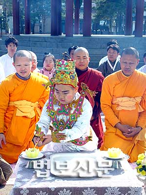 탑을 감고 있던 실의 한 가닥이 재원이의 손목에 묶이는 것으로 탑 앞에서의 일정이 끝나자 선원에서 본격적인 출가 의식이 시작됐다.
