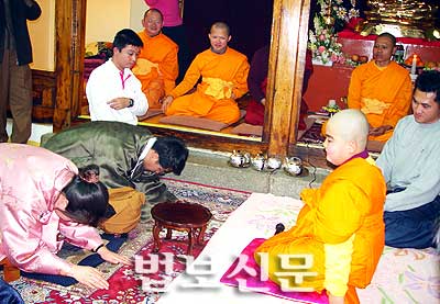 <사진설명>고모와 고모부에게 삼배를 받는 냐냐 스님“깨달음을 얻기 위해서는 수행을 해야 합니다. 머리카락, 피부, 뼈를 포함한 몸은 살아있거나, 죽어있거나 관계없이 항상 변하고 있습니다. 이를 잘 알고 열반을 위해 노력하도록 하십시오”