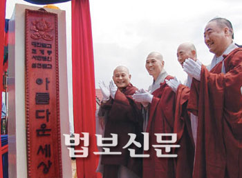 <사진설명>한국과 캄보디아 주요 인사들이 ‘아름다운 세상’이라고 적힌 한글 현판 제막식을 갖고 BWC의 준공을 선포했다. 두 나라 사부대중 500여명은 힘찬 박수와 환호로 BWC의 출범을 축하했다.실천불교전국승가회(공동의장 성관·효림 스님) 산하 사단법인 실천불교가 세계 7대 불가사의 중 하나인 앙코르와트의 나라 캄보디아에 종합복지타운을 준공했다.