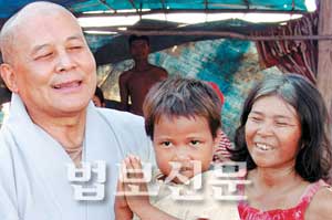<사진설명>빈민촌을 방문한 지관 스님.BWC 준공식이 있던 오후. 총무원장 지관 스님과 한국의 축하 사절단은 버스로 1시간을 달려 아시아 최대의 호수 톤레삽에 도착했다. 육지속의 바다로 불리는 이곳은 호수 크기가 경상남북도를 합한 규모로 주변에는 허술한 나무집들이 끝없이 이어진 빈민촌이 형성돼 있다. 차량 한 대가 겨우 통과할 정도로 좁은 비포장도로를 지나 마을 중간에 도착하자 버스 주위에는 금세 현지인들로 가득 찼다.