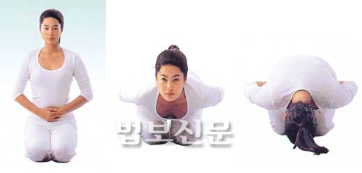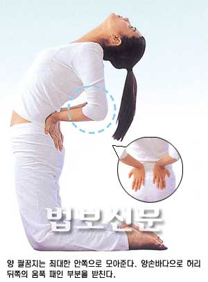 ① 무릎을 어깨 넓이만큼 벌리고 무릎으로 선다. 이때 무릎 사이, 골반, 어깨넓이는 간은 간격으로 11자가 되도록 한다. ② 양손바닥으로 허리 뒤쪽에 대고 상체를 받쳐준다. ③ 양손으로 허리를 지탱하며 상체를 뒤로 젖힌다. 이때 고개도 뒤로 넘기고 가슴은 천장을, 시선은 뒷벽을 향한다. 가슴보다 넓게 펴주기 위해 몸을 뒤로 젖힐 때 양팔꿈치를 최대한 모아준다는 기분으로 모은다. 골반과 허벅지를 앞쪽으로 밀어준다는 느낌으로 자세를 취한다. 완성자세를 1분가량 유지한다. ④ 뒤로 젖혔던 상체를 천천히 앞으로 세우고 팔도 풀어준 다음 숨을 고른다. ⑤ 반복해서 할 때는 처음보다 강하게 몸을 뒤로 젖힌다.◆ 개구리 자세