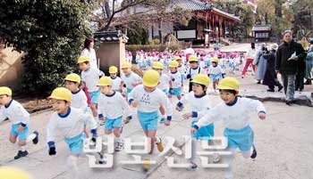 제법 찬 새벽바람이 옷섶을 헤집고 밀려들어온다. 벙어리장갑에 목도리를 칭칭 휘감은 완전무장의 자세로 사이다이지(西大寺)에 들어섰다. 그런데 저런! 별안간 짧은 반바지에 타이즈를 신은 꼬맹이들 수십 명이 병아리 떼처럼 몰려오고 있다. 영락없이 미야자키 하야오 감독의 애니메이션 ‘이웃집 토토로’에 등장하는 ‘메이’들이다.