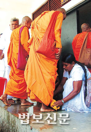 | <사진설명>공양을 올리기 위해 스님을 초대하는 경우 스리랑카 불자들은 스님의 맨발을 정성스럽게 닦아 준다. 스리랑카 불자들에게 이러한 행동은 지극한 신심의 표현이며 더 없는 영광이다. |