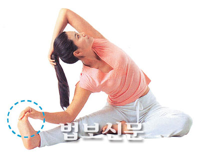 ●방법 : ① 양다리를 편한 정도로 벌리고 앉는다. ② 오른쪽 다리는 앞으로 뻗고, 왼쪽 다리는 구부려서 오른쪽 허벅지 안쪽에 갖다 댄다. ③ 숨을 들이마시면서 왼팔을 머리 뒤로 보내서 삼각형 모양을 만든다. 옆구리를 길게 늘리는 느낌으로 스트레칭 한다. 오른 손으로는 오른쪽 발가락을 잡아서 당겨준다. 이때 오른쪽 다리는 쭉 뻗어야 하며 시선은 천장을 향한다. 오른쪽 다리가 잘 펴지지 않으면 무릎을 살짝 구부려도 된다. ④ 숨을 내쉬면서 최대한 기울여준다. ⑤ 반대쪽도 같은 방법으로 좌우 30초씩 자세를 유지한다.