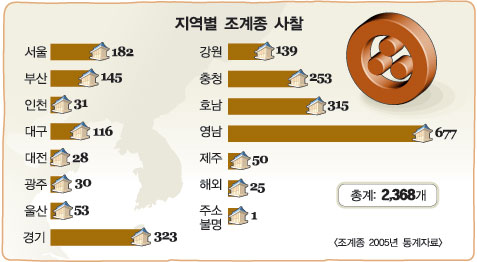 불교세가 강한 영남이 677개로 가장 많았고, 호남은 영남의 절반에도 미치지 못하는 315개였다. 광역시에서도 영호남의 차이는 극명해서 부산 145개, 대구 116개 등 이들 지역의 조계종 사찰수가 100개를 상회하는데 반해 광주는 대전보다도 적은 20개에 불과했다. 또 인구 1200만의 서울에 조계종 사찰이 182개뿐이라는 사실도 수도권 포교의 취약성을 여실히 드러낸 한 단면이었다. 이외에 미국과 서유럽 등 해외에 25개의 조계종 사찰이 활동하고 있는 것으로 조사됐다.