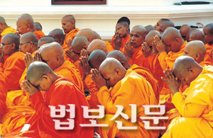 | <사진설명>기도를 마친 스님들이 불자들 손목에 흰 실을 감아주고 있다. 교육 중심주의 승가는 이같은 법회와 기도 등을 통해 포교와 신도교육에 주력한다. |