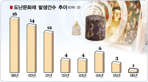 1999년부터 2006년까지 조계종 총무원 문화부에 신고된 성보문화재 도난사건 발생 건수이다.