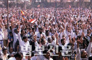 | <사진설명>천민 출신의 인도인들이 한 자리에 모여 인간의 기본 권리와 평등에 대하여 외치고 있다. |