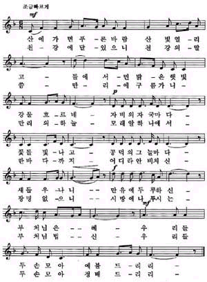 곡의 분석 이 곡은 24마디 세 도막 형식으로 되어 있으며, 8분의 6박자 민요풍으로 된 곡이다. '산에 가면 푸른 바람'은 이 곡의 주제로서 8분의 6박자의 리듬꼴에 주의해야 한다. '산 빛 열리고'에서는 연결구 부분이므로 셈여림을 주제보다 더 강하게 할 필요가 있고, '들에 서면 밝은 햇빛'에 있어서는 도약 음정이 많이 사용되었기에 음정에 주의해야 한다. '강물 흐르네'에서는 A부분의 종지형이므로 곡이 끝나는 분위기로 노래해야 한다. '자비의 자국마다 꽃들 빛나고'는 이 곡의 새로운 시작 부분이므로 노래하는 분위기를 바꾸어 더욱 경쾌하게 노래할 필요가 있다. 음정에 있어서는 동음진행을 하고 있기 때문에 문제가 없으며 리듬에 주의해야 한다. '공덕의 그늘마다 새들 우나니'는 다음 선율을 위한 연결구 부분이므로 앞부분과 같은 분위기로 노래해야 한다. '만유에 두루하신'은 이 곡의 절정부분으로 리듬 및 음정에 맞추어 신나게 노래해야한다. '우리들 두 손 모아 예불드리리'는 이 곡의 종지부분이므로 점점 작게 노래해야 하며, 곡이 끝나는 분위기를 충분히 살려야 한다.
