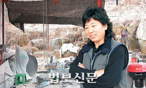 | <사진설명>돌을 깍고 자르는 육중한 기계 앞에서도 미소를 보이는 작가. 그의 심성 속에는 강함과 부드러움이 균형있게 공존하고 있을 것이다. |