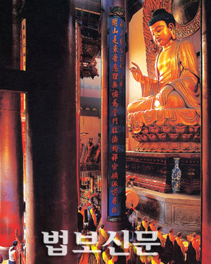 | <사진설명>영은사 대웅보전에 봉안돼 있는 24.8미터의 목조 석가모니불. 사진은 중국여행출판사가 발행한 「영은사」에 수록된 대웅보전 전경이다. |
