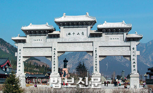 | <사진설명>우리의 일주문 정도에 해당하는 패방에 새겨진 ‘숭산소림’이라는 글자가 소림사에 들어섰음을 알려준다. |