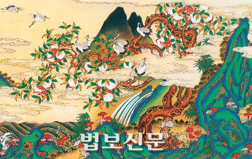 십장생도: 장수(長壽)의 상징인 거북이, 사슴, 구름 등을 한 화면에 배치하여 장식적으로 처리한 그림이다.