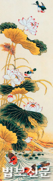 한 폭의 ‘연화도’지만 하늘거리는 연꽃 한 잎에 충만한 자비를 엿볼 수 있다. 작은 연못에 다소곳이 피어있을 연꽃 위를 내려앉은 새 한 마리나, 그 위를 넘어서는 새 한 마리를 보고 있노라면 어느 새 유유자적하고 있는 자신의 모습에 웃음을 짓는다.