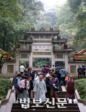 | <사진설명>조계 남화선사 조전 뒷편에는 혜능 스님이 주장자로 찍어 물길을 낸 탁석천이 있다. 순례단이 탁석천으로 들어가는 패방을 나서고 있다. |