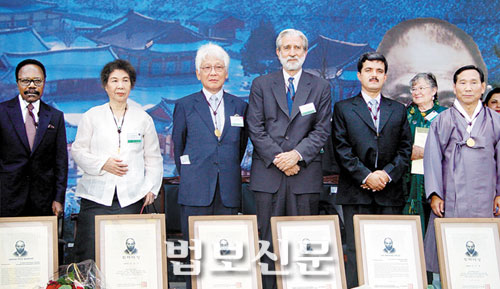 | <사진설명>제11회 만해대상을 수상한 영광의 얼굴들. 왼쪽부터 봉고 온딤바 대통령, 김남조 시인, 유종호 교수, 랭카스터 교수, 니스투리론 회장, 서인혁 총재. |