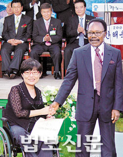 만해대상 평화부문 수상자인 가봉공화국의 엘 하지 오마르 봉고 온딤바 대통령이 만해대상 상금 3000만원을 한국장애인문인협회에 기증했다.〈사진〉 만해대상 시상식에 이어 곧바로 기증 의사를 밝힌 온딤바 대통령은 현장에서 한국장애인문인협회 방귀희 회장에게 상금을 전달하며 “장애인 문학 발전을 위해 써 달라”고 당부해 참석자들의 박수갈채를 받았다.