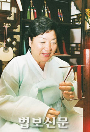 | <사진설명>40여년 매듭일에만 전념해 온 심영미 장인이 비톳에 실을 걸어 꼬고 있다. 사진=채한기 기자. |